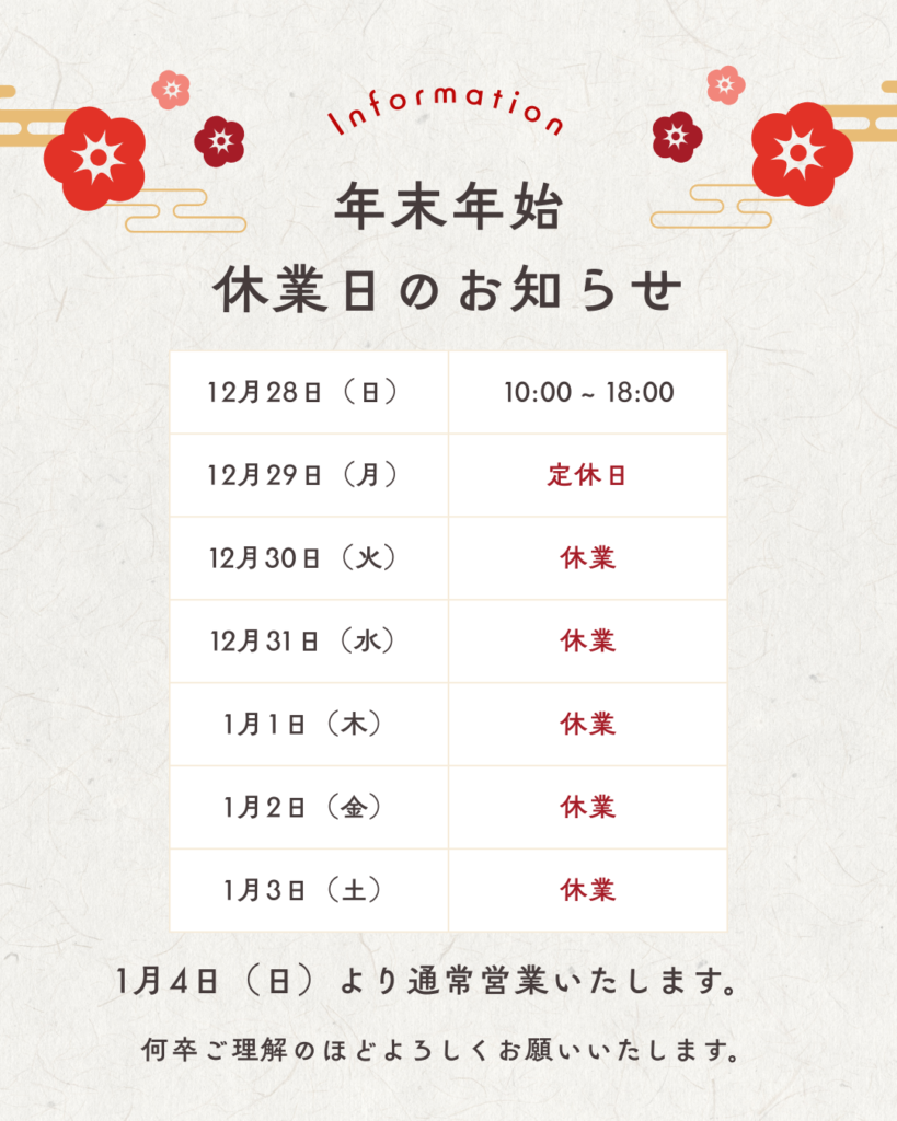 年末年始は12月29日(月)から1月3日(土)まで休業とさせていただきます。